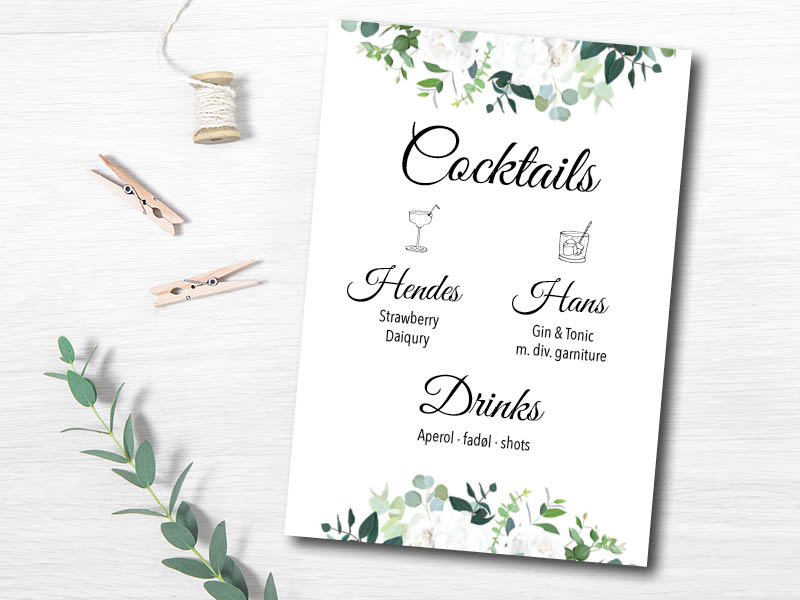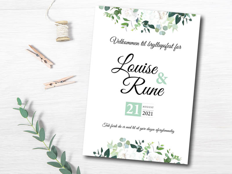 Bryllupskategorier Fuldend dit bryllup Invitationer til bryllup Save the date Takkekort Menuløber Bordkort Bordnummer Bordplan Drinkskort Velkomstplakat