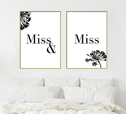 Miss & Miss plakater i sort og hvid med grafisk illustration. Leveres i sæt bestående af 1 stk. Miss & og 1 stk. Miss plakat i den valgte størrelse.