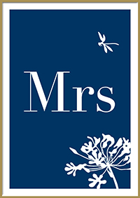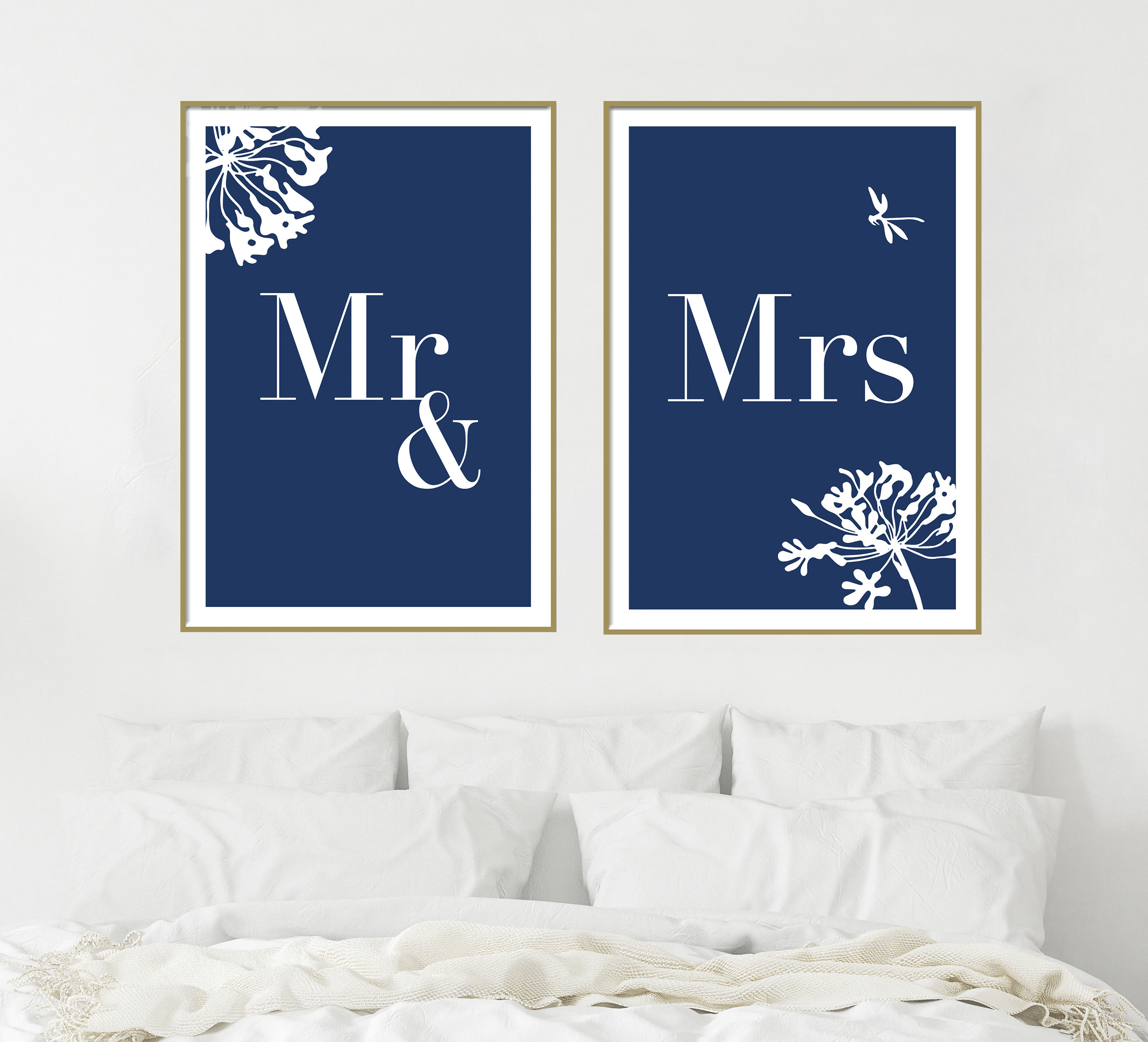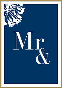 Mr & Mrs plakater i moderne mørkeblå med grafisk illustration. Leveres i sæt bestående af 1 stk. Mr. og 1 stk. Mrs plakat i den valgte størrelse.