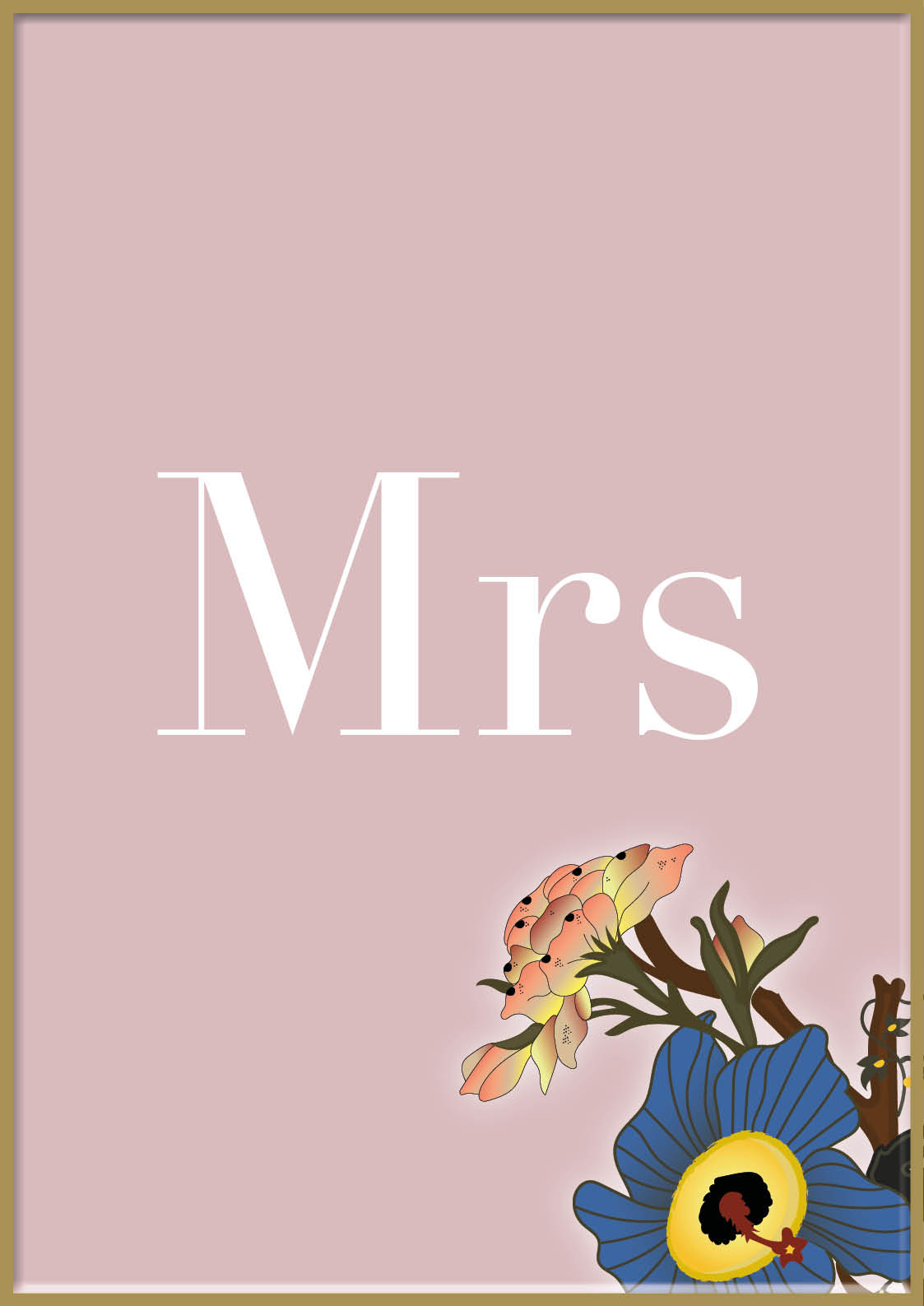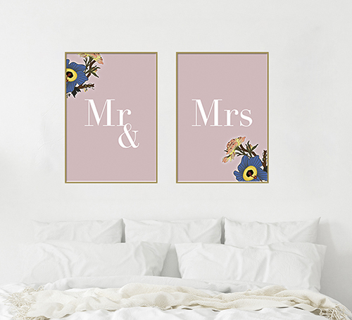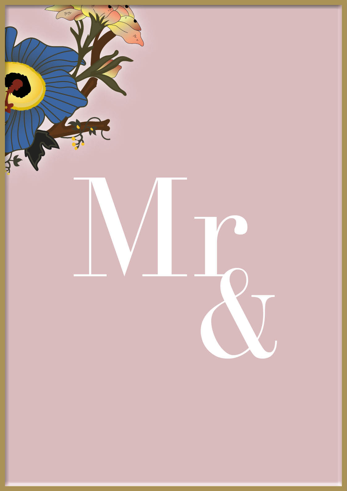 Mr & Mrs plakater i moderne lyserød med sort illustration. Leveres i sæt bestående af 1 stk. mr. og 1 stk. mrs plakat i den valgte størrelse.