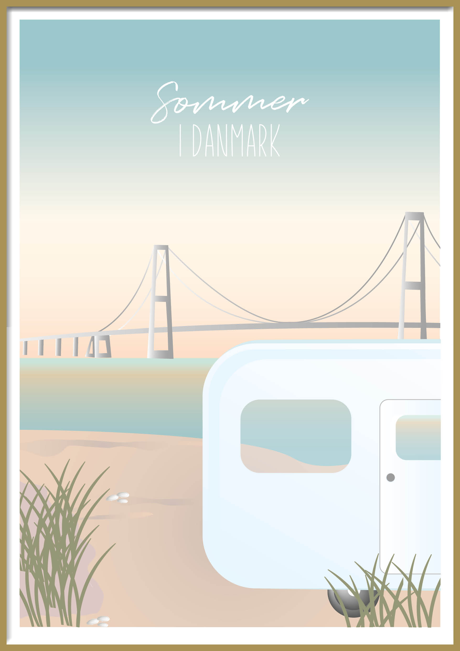 Smuk pastel-farvet plakat med sommerferie stemning. Campingidyl på stranden.