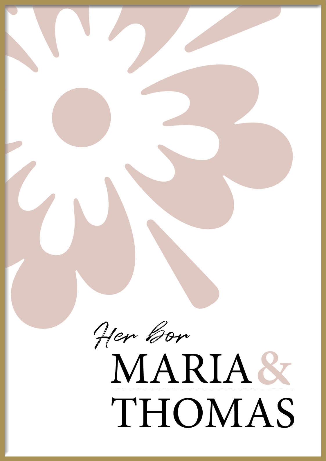 Personaliseret velkomstplakat med grafisk illustration af blomst.